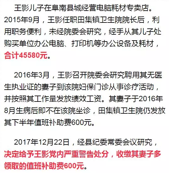 田集镇卫生院院长王影 违规为其儿子 经营活动牟取利益等问题